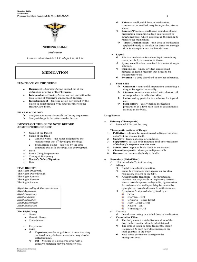 Pharmacology Nursing Student Study Guide Template, Medications Review